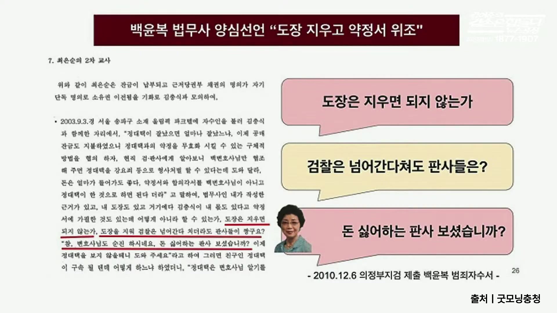 2003.9.3.경 서울 송파구 소재 올림픽 파크텔에 자수인을 불러 김충식 과 함께한 자리에서, "장대택이 잘났으면 얼마나 잘났느냐. 이제 공대 잔금도 지불하였으니 경대백과의 약정을 무효화 시킬 수 있는 구체적 방법을 협의 하자, 현직 검·판사에게 알아보니 백변호사님만 헬조 해 주면 경대책을 강요죄 등으로 형사처벌 할 수 있다는데 도와 달라, 돈은 얼마가 들어가도 좋다. 약정서와 합의각서를 백변호사님이 아니고 경대택이 한 것으로 하면 된다 더라"고 말하여, 법무사인 내가 작성한 근거가 있고, 내 도장도 있고 거기에다 김충식이 내 몫도 있다고 악장 서에 가필한 것도 있는데 어떻게 아니라 할 수 있는가, 도장은 지우면