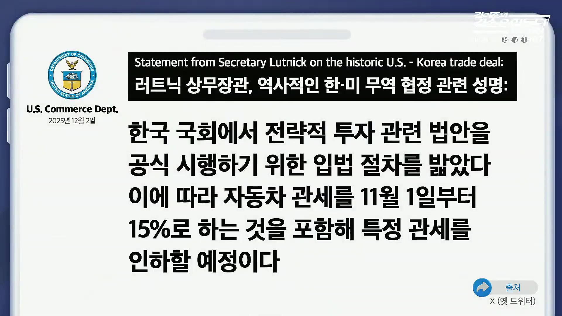 러트닉 상무장관, 역사적인 한·미 무역 협정 관련 성명: