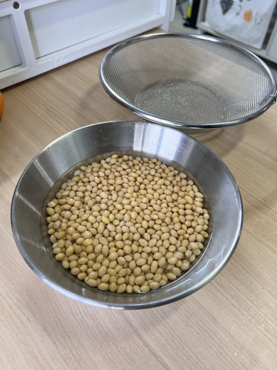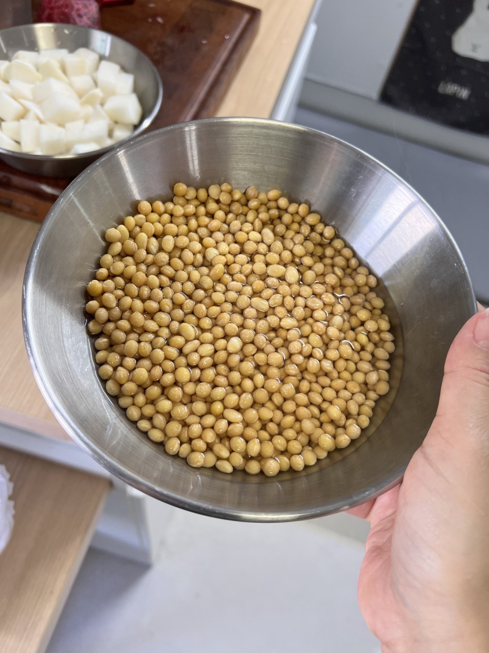 콩을 담아놓은 채로, 대략 1시간 정도만 불려주세요.