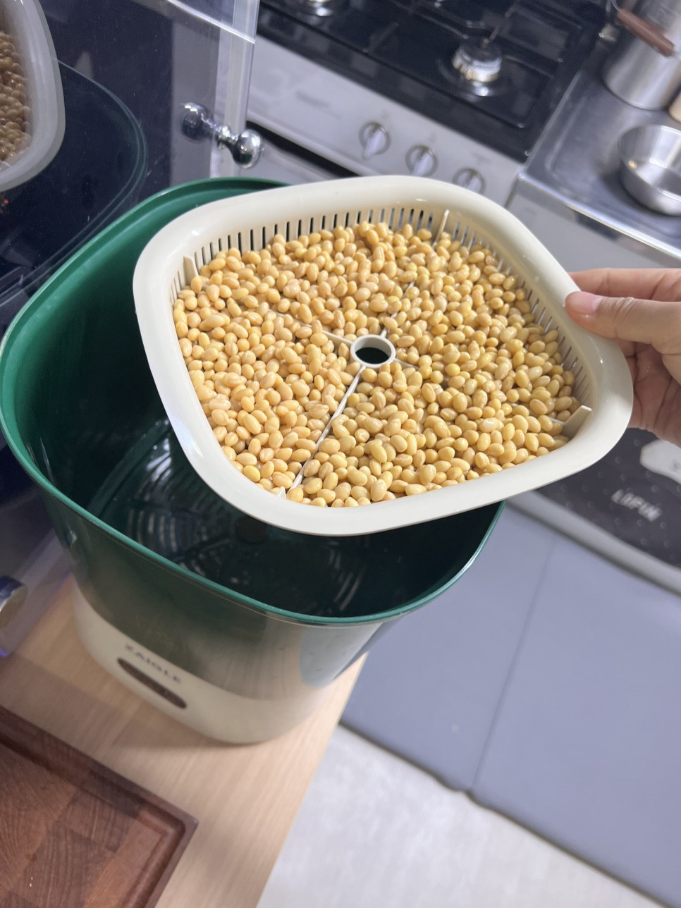 먼저 물을 채우고 통을 끼운 후, 그 위에 콩 놓은 판을 올려줍니다.