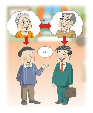촌은 매우 흔하고도 가까운 관계이다. 사촌은 크게 아버지 동기의 자녀와 어머니 동기 의 자녀로 나눌 수 있는데 그 사촌이 나보다 손위인지 손아래인지 또 남자인지 여자인 지에 따라 부르는 말과 가리키는 말이 달라진다.