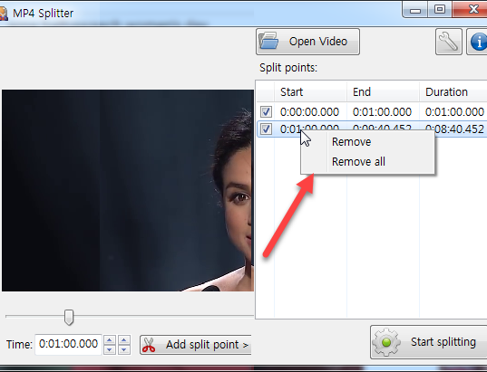 여기에서 Time을 1분으로 지정한 다음 Add split point를 누른다.