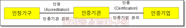 ISO 인증제도는 조직의 품질, 환경, 안전 등의 경영시스템이 국제표준(ISO)에 적합하게 구축되어 있음을 인증하는 제도로, 각국의 인정기구가 인증기관을 인정하고 인증기관은 기업의 경영시스템을 인증하는 구조로 되어 있습니다.