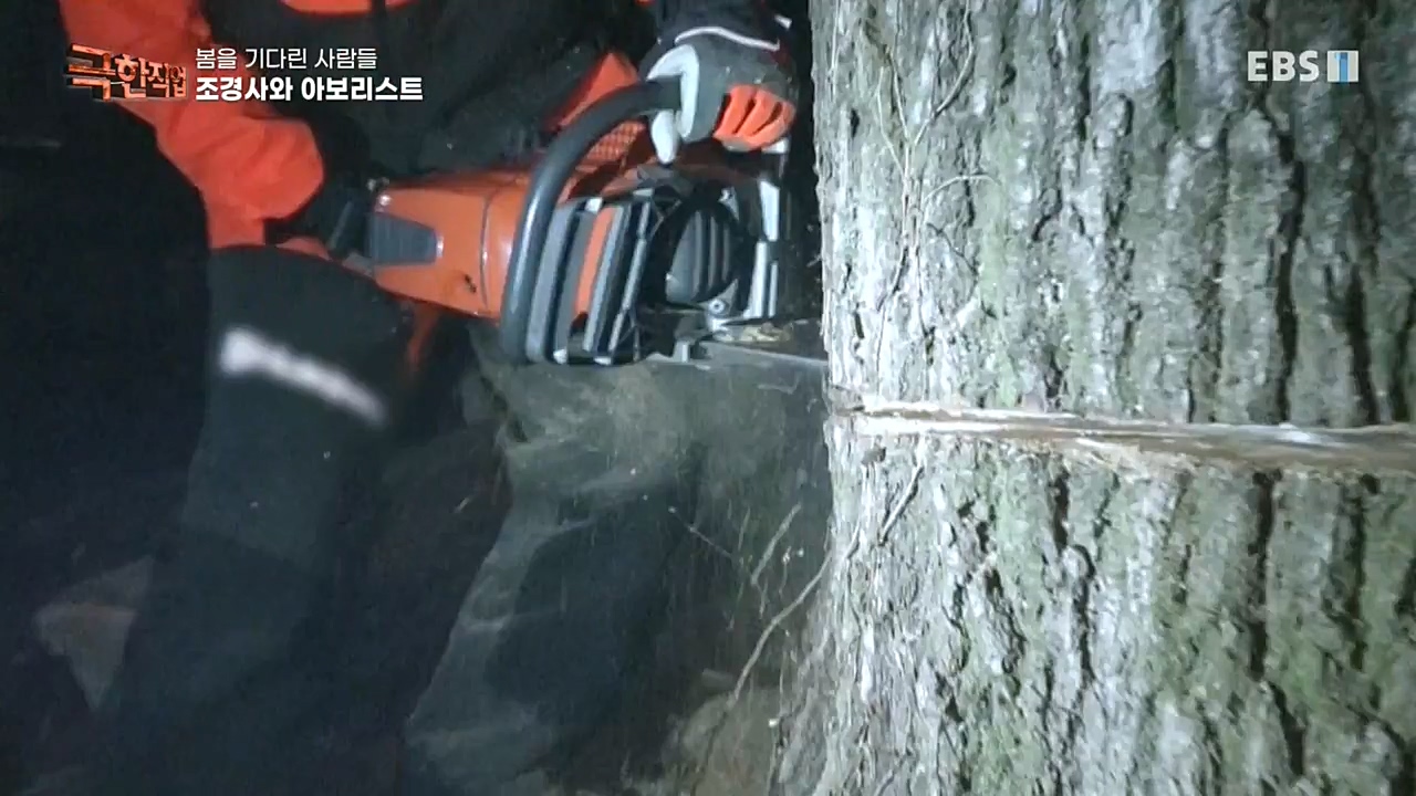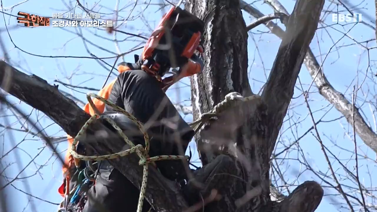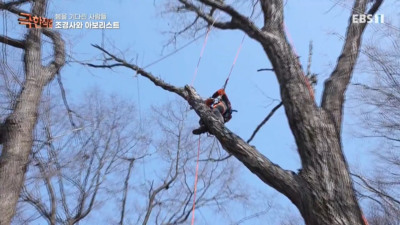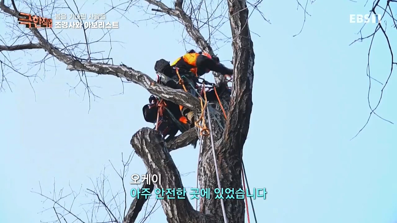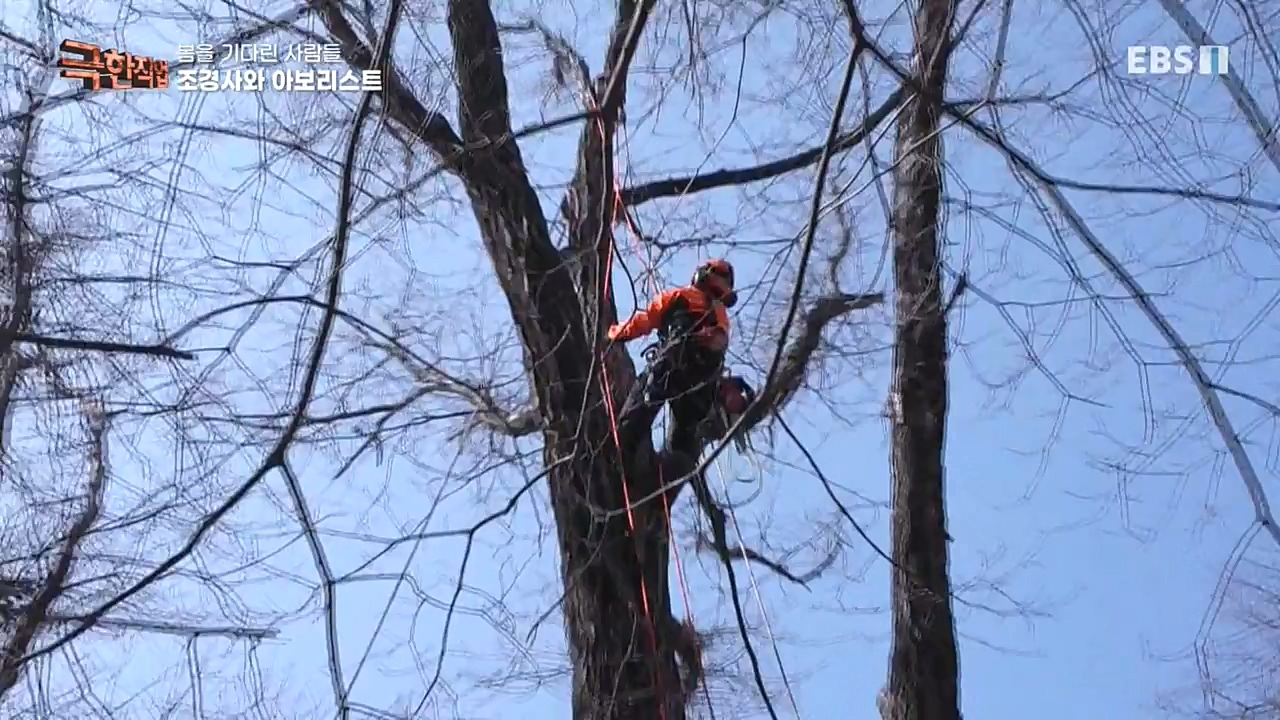 바로 클라이밍 장비를 이용해 나무 위에서 일하는 수목 관리전문가, 아보리스트.