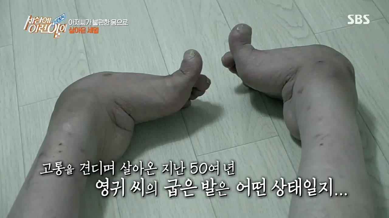 발이 안쪽으로 180도 가까이 돌아가있을 뿐 아니라, 발등과 발바닥의 위치가 아예 바뀌어 있는 모습이다. 주영귀(51) 씨는 발등으로 땅을 디디며 평생 ...