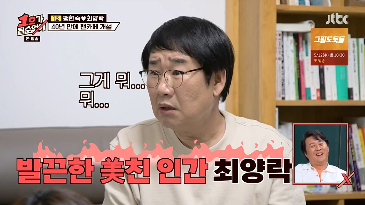 데뷔 40주년을 맞은 최양락이 팽현숙과 함께 팬카페를 개설했다. 9일 방송되는 JTBC '1호가 될 순 없어'에서는 최양락의 데뷔 40주년 팬미팅 준비 ...