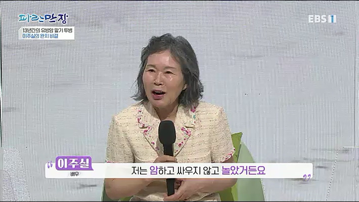 8일 방송된 EBS1 시사교양 프로그램 '파란만장'에는 배우 이주실이 게스트로 출연해 '암과 싸우다'를 주제로 이야기를 나눴다. 이날 57년 차 배우 이주실 ...