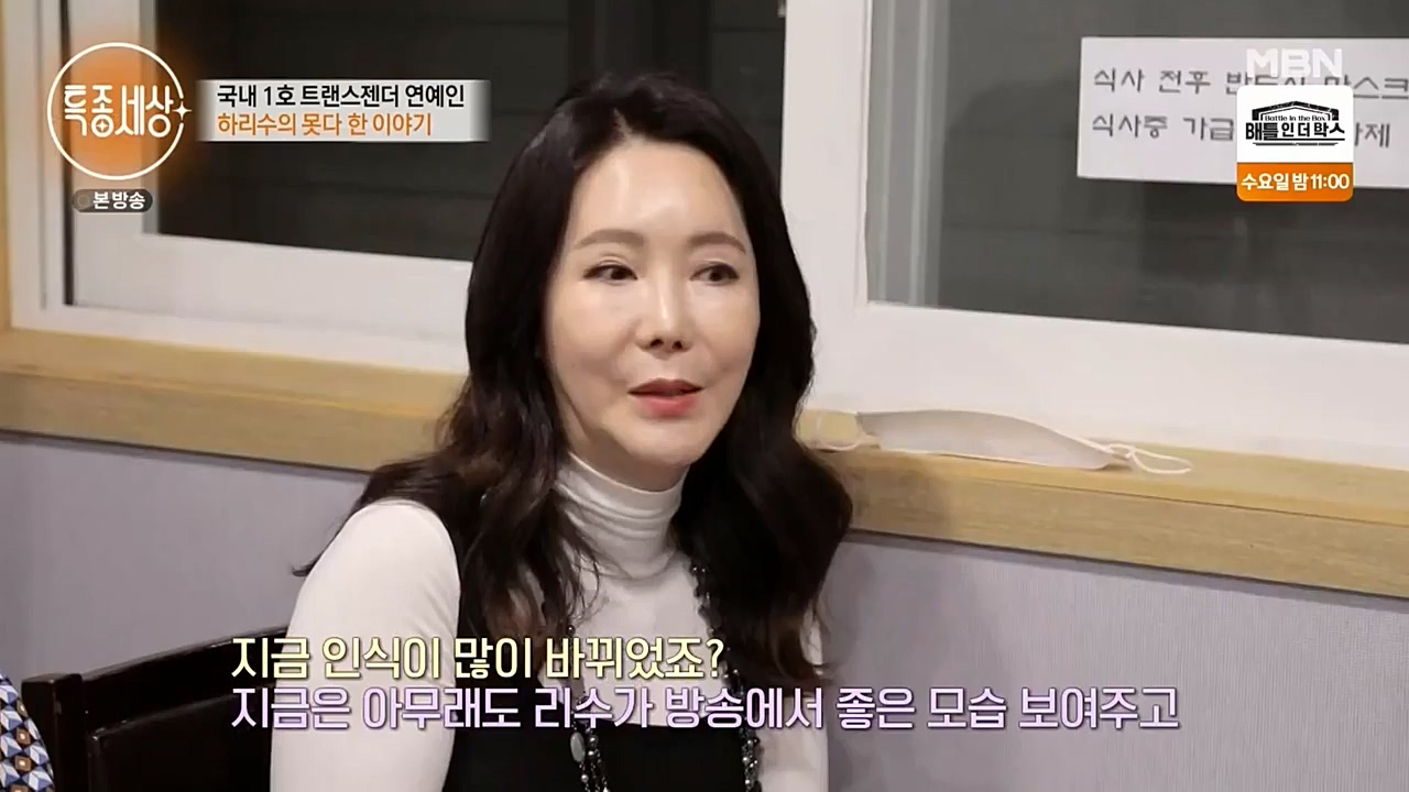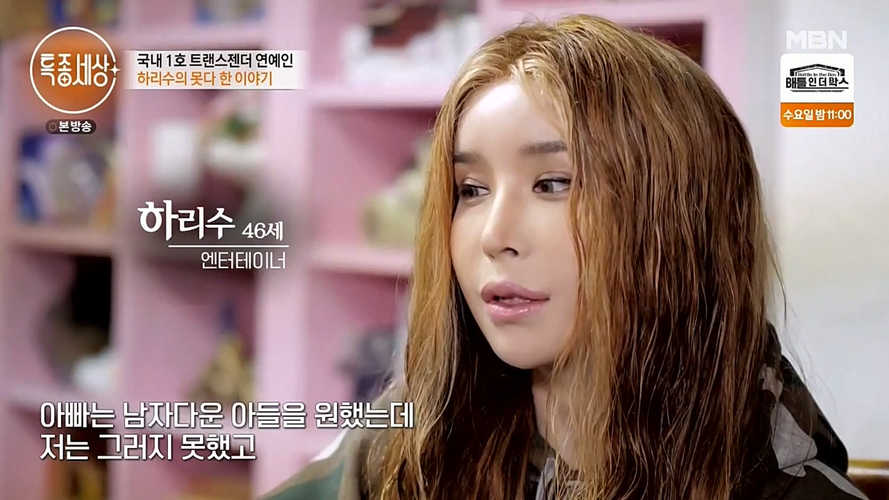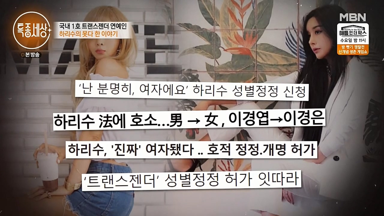 지난 23일 방송된 MBN 예능프로그램 '현장르포 특종세상'에는 하리수가 출연해 근황을 공개했다. 이날 하리수는 친분이 있는 트랜스젠더 언니들과 만나...