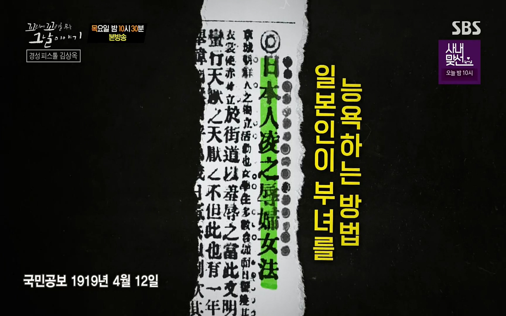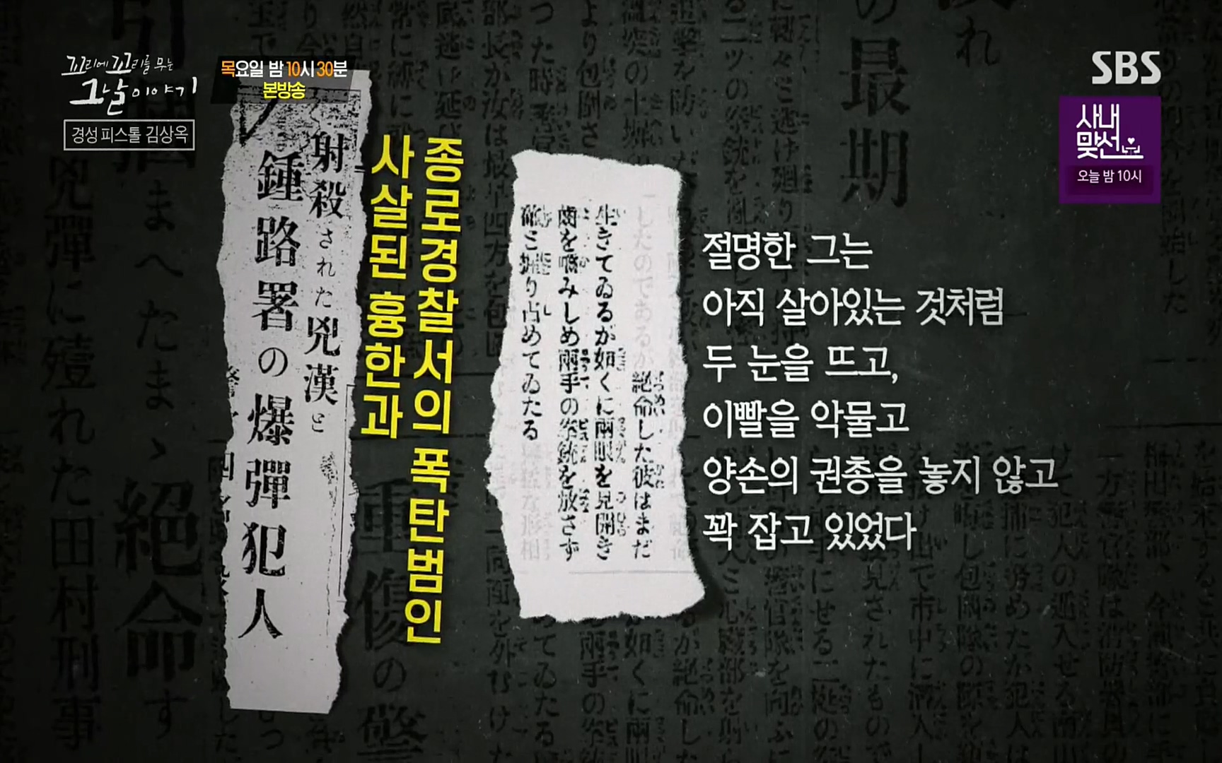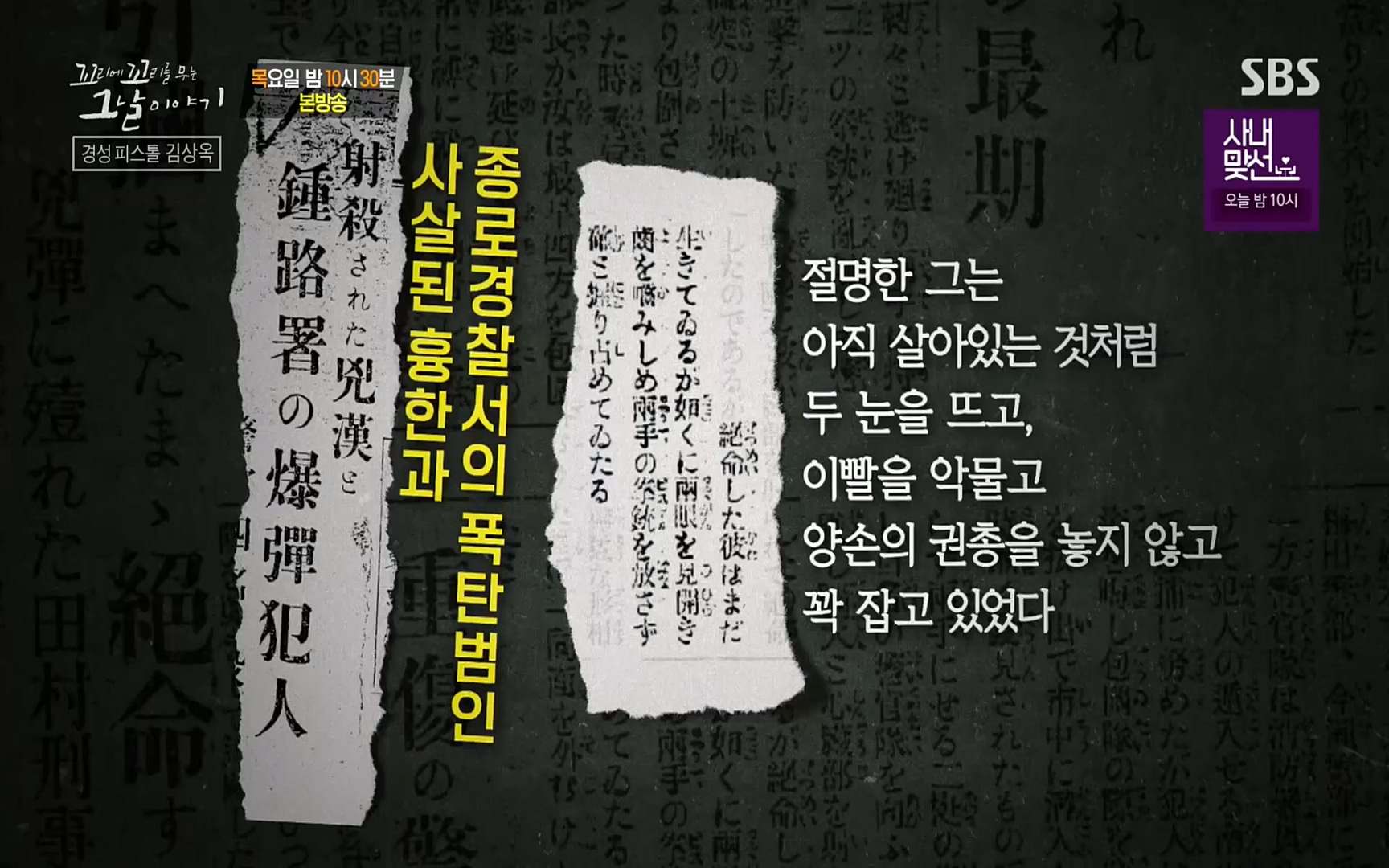 [한국강사신문 이미숙 기자] 영화 '암살'과 '밀정'의 모티브가 됐던, 영화보다 더 영화 같은 SBS '꼬리에 꼬리를 무는 그날 이야기'의 다섯 번째...