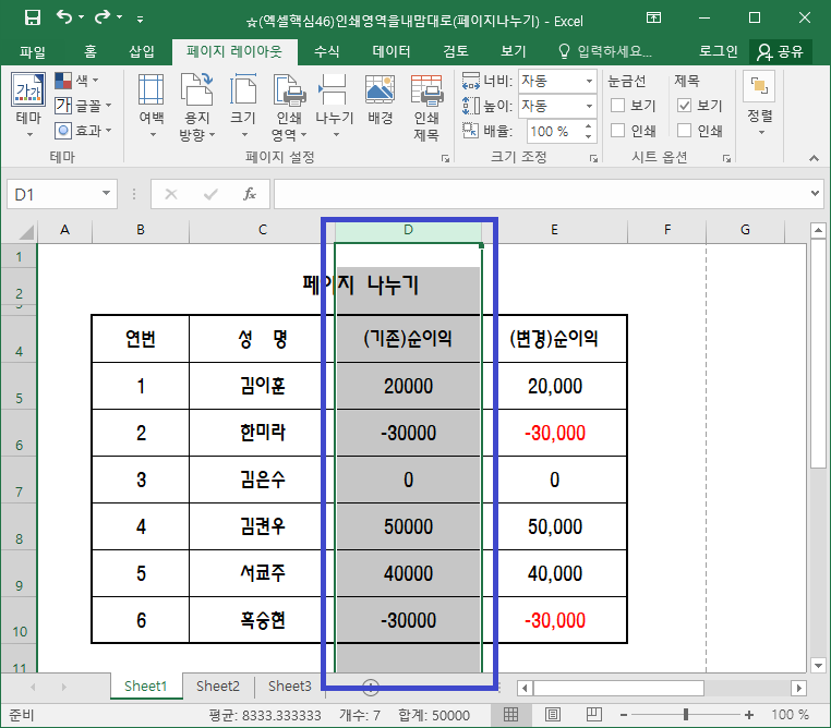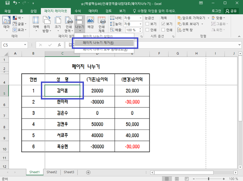 [엑셀] 페이지 나누기 및 제거하기(페이지 레이아웃)