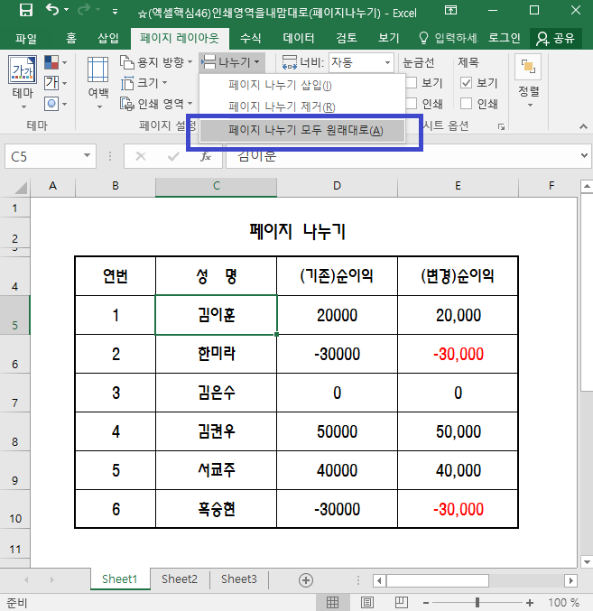 페이지 나누기 제거는