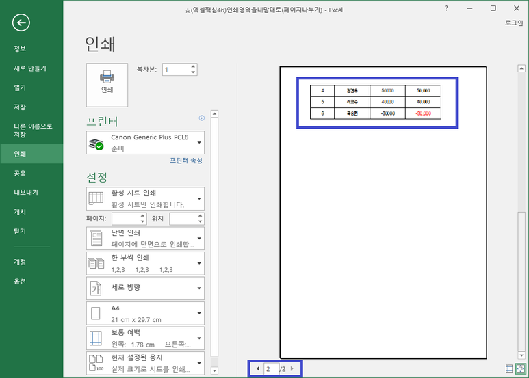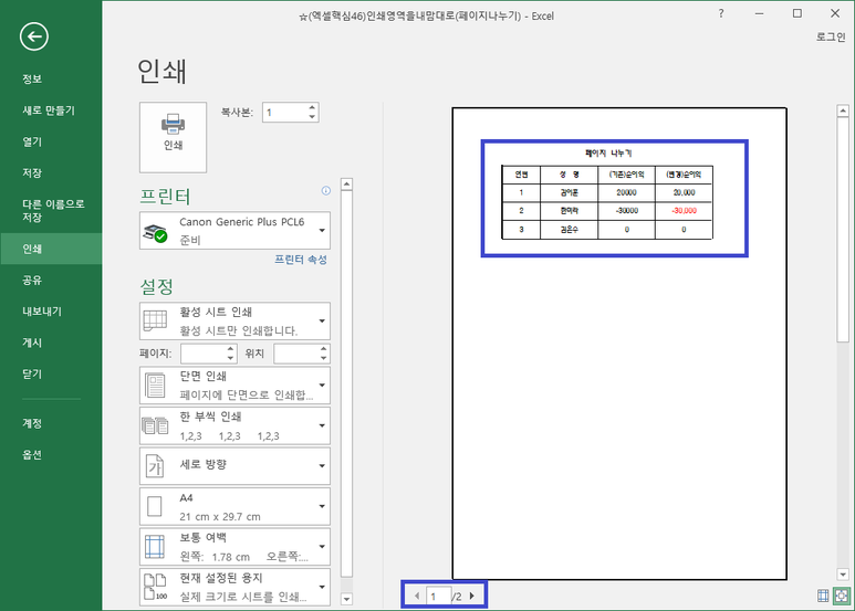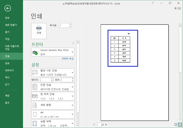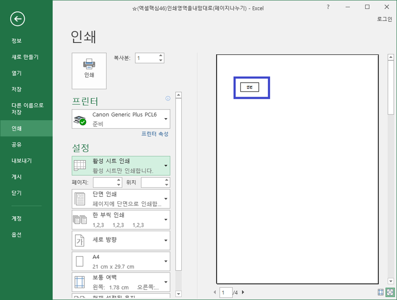 이렇게 인쇄 영역이 이상할 경우.