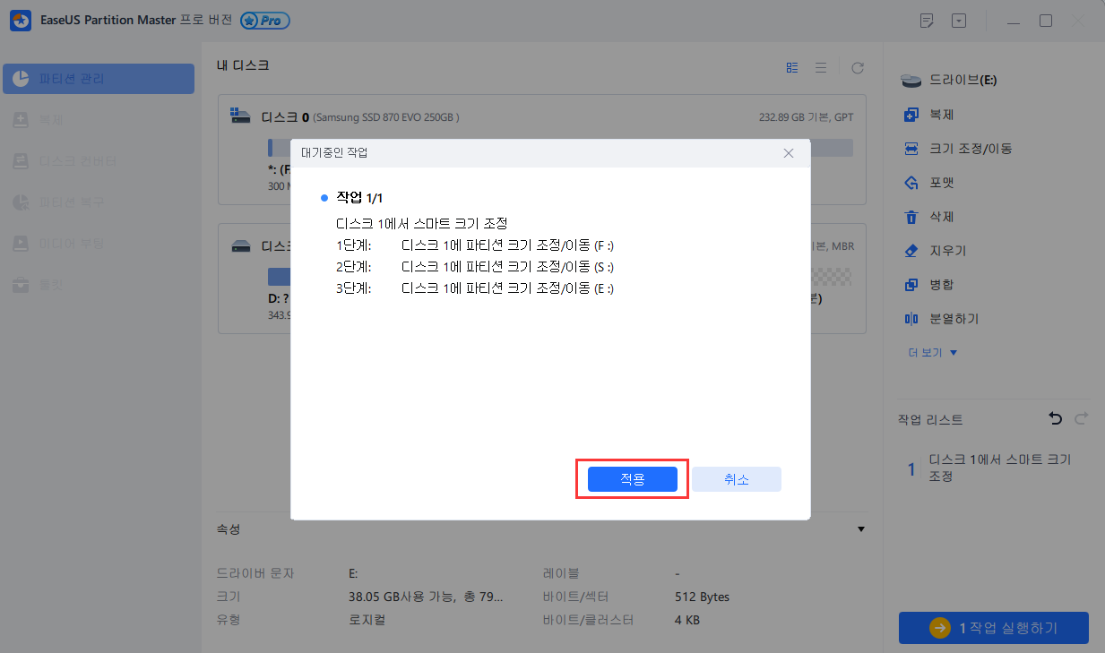 오른쪽 하단의 "작업 실행하기"를 클릭하고 "적용"을 클릭하여 모든 변경 사항을 유지하여 드라이브를 확장하십시오.