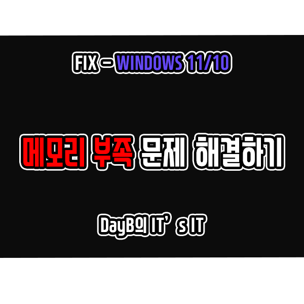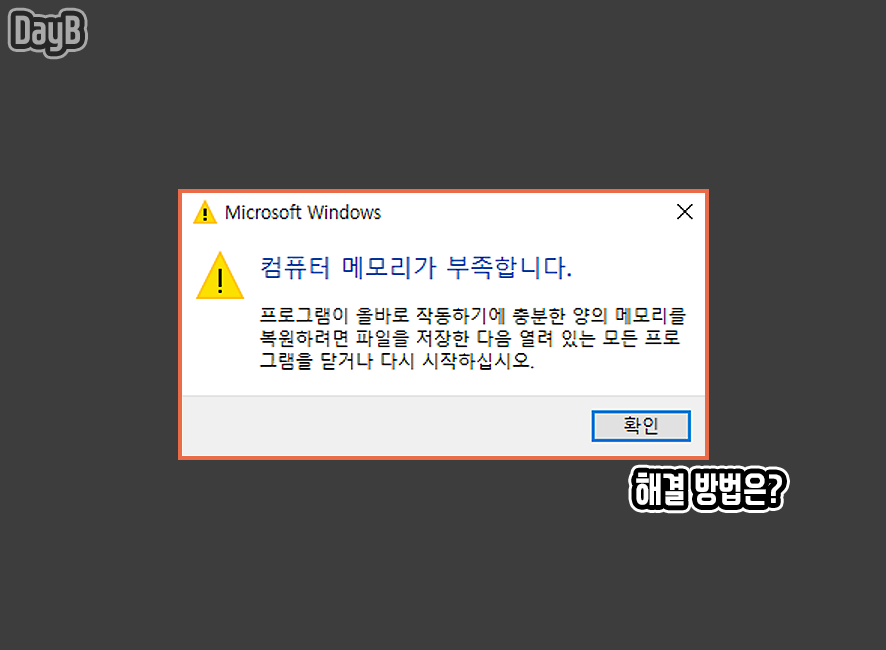 안녕하세요. DayB입니다. 윈도우11, 10이 설치된 컴퓨터에서 프로그램을 실행하거나 실행 도중 종종 다음과 같은 메모리 부족 문제로 인하여 원활한 사용이 불가능한 상황이 발생할 수 있습니다.