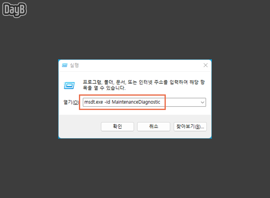 실행창에서 다음 명령을 입력한 뒤, 엔터키를 눌러줍니다.