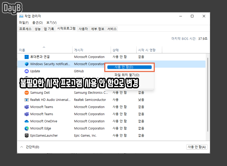 이어 등록된 시작 프로그램 중 불필요한 항목을 선택하고 우 클릭 - 사용 안 함으로 변경해 주면 됩니다.