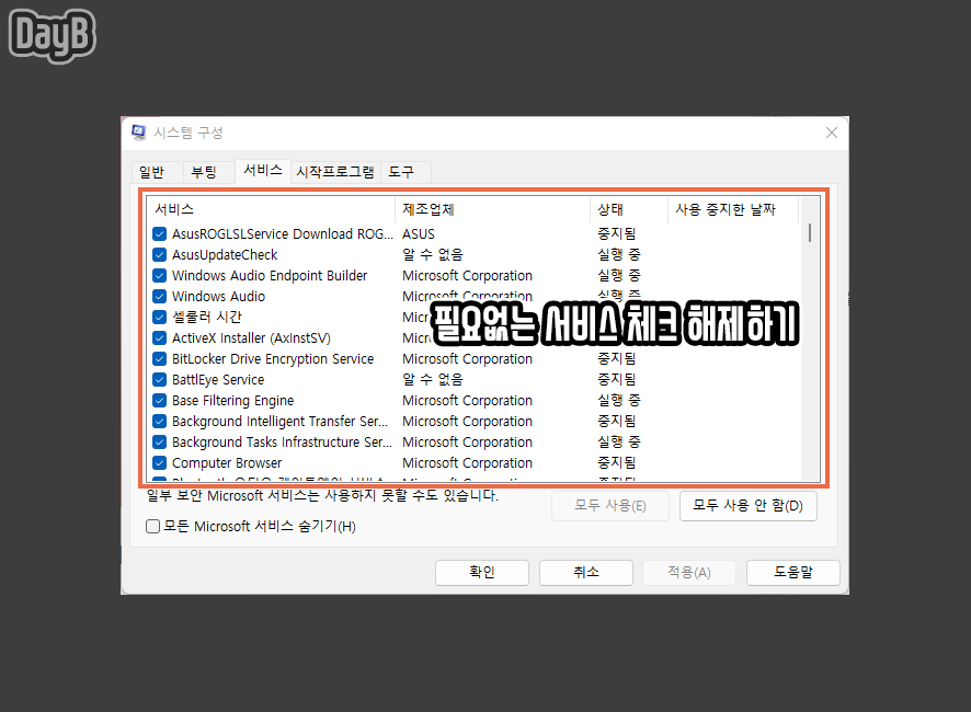 하지만 윈도우 구동을 위해서는 필수적인 서비스들이 존재하는데, 이들을 분류하기 어렵다면 하단에 있는 '모든 Microsoft 서비스 숨기기'를 체크하여 윈도우 서비스들을 제외한 타사 서비스만 분류하여 정리할 수 있습니다.