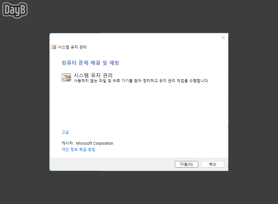 시스템 유지 관리자 실행되면 이후 과정을 진행해 주시면 됩니다. 문제가 있을 경우 자동으로 진단 및 복구가 가능합니다.