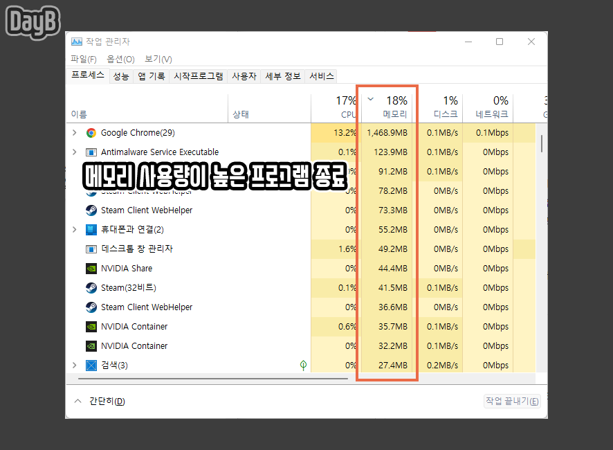 방법은 간단합니다. 작업 관리자(Ctrl + Shift + ESC)를 열고, 메모리를 클릭하면 메모리를 사용하는 모든 프로그램이 내림차순으로 정렬됩니다. 이를 기준으로 사용량이 높은 프로그램 또는 서비스를 찾아 우 클릭 - 작업 끝내기를 적용해 주면 됩니다.