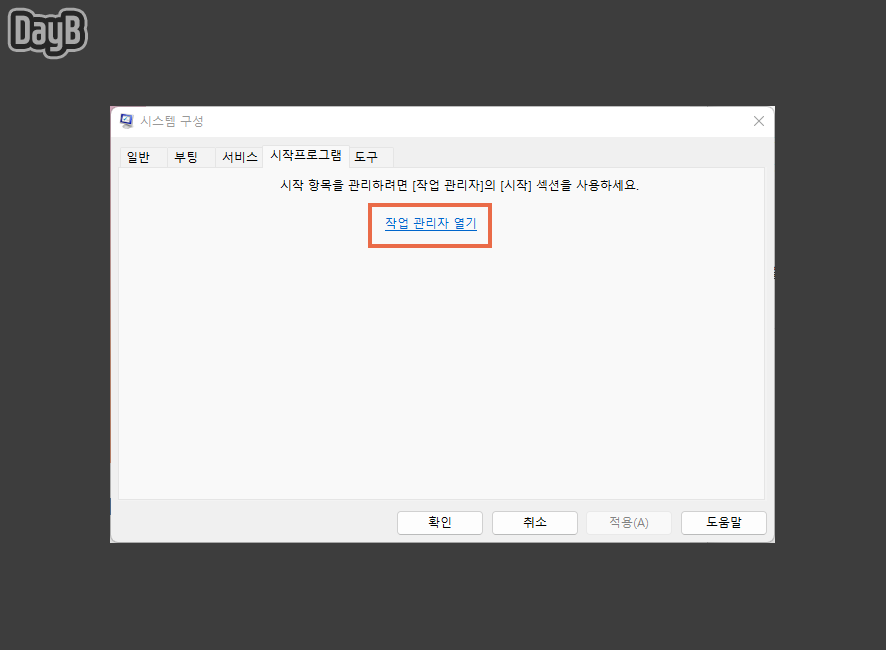 이어서 상단 메뉴중 시작 프로그램을 선택하고 하단의 작업 관리자 열기 링크를 클릭합니다.