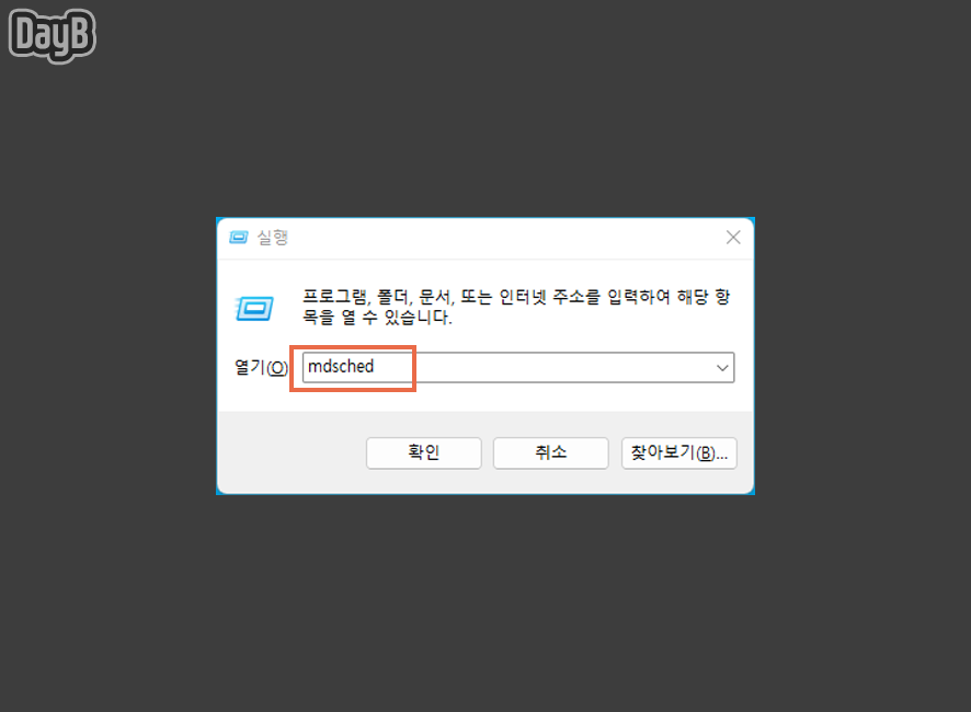 실행창에서 mdsched를 입력한 뒤, 엔터키를 눌러줍니다.