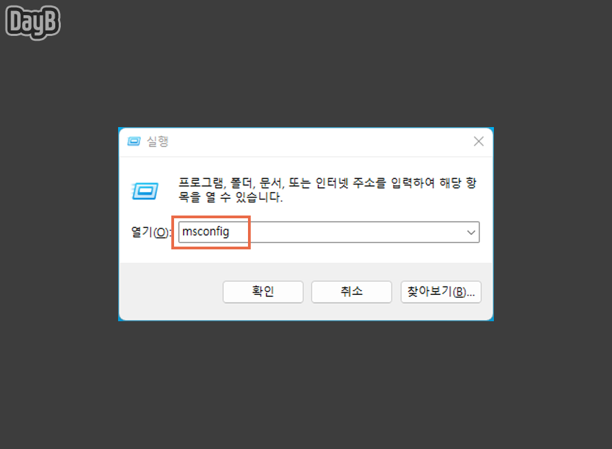 실행창(Win키 + R)에 msconfig를 입력한 뒤, 엔터키를 눌러줍니다.