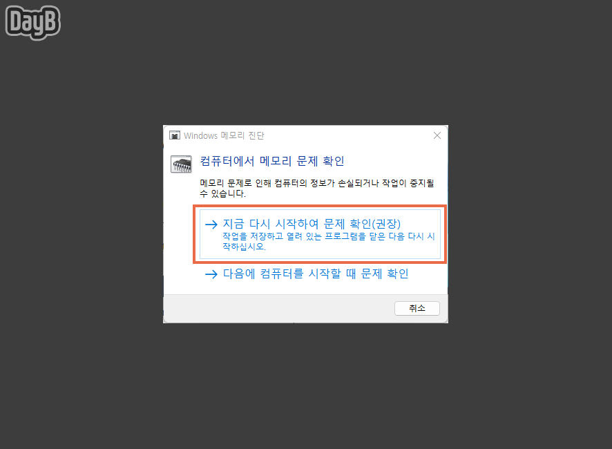 Windows 메모리 진단 도구가 실행되면 지금 다시 시작하여 문제 확인을 클릭하여 이후 과정을 진행해 주면 됩니다.