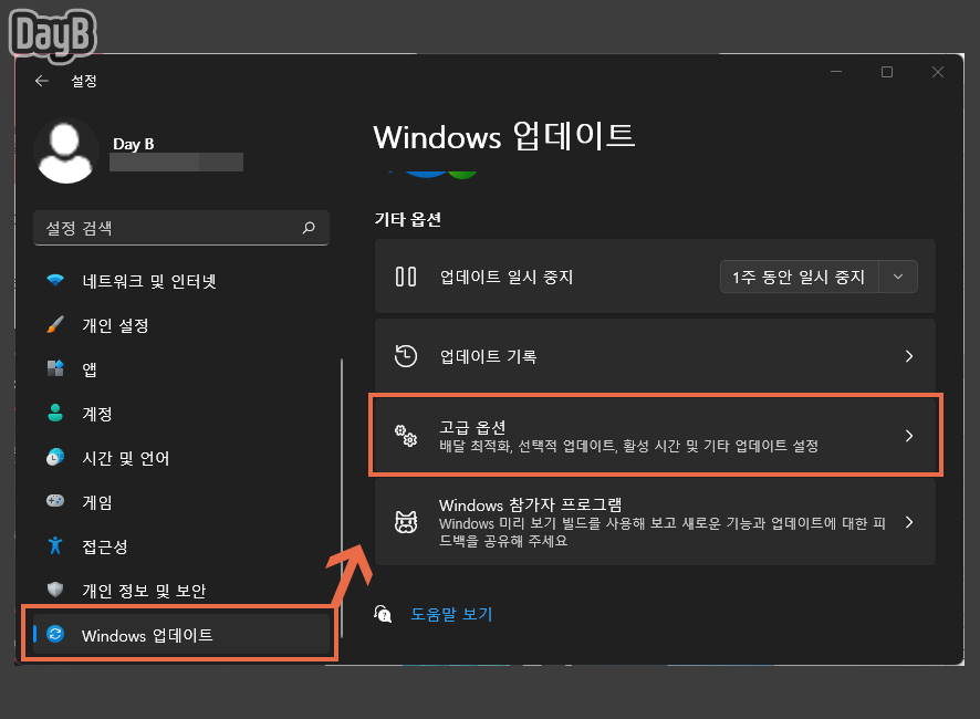 Windows 설정(Win키 + i) - Windows 업데이트 - 고급 옵션에 들어갑니다.