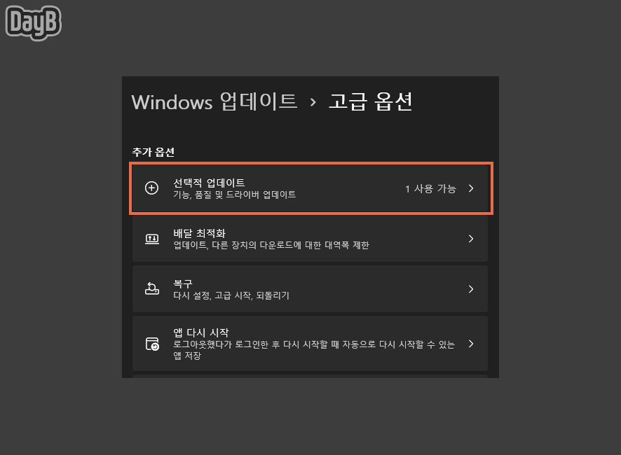 이어 선택적 업데이트를 클릭합니다. (설치 가능한 항목이 있다면 위와 같이 표기되니 참고하시길 바랍니다.)
