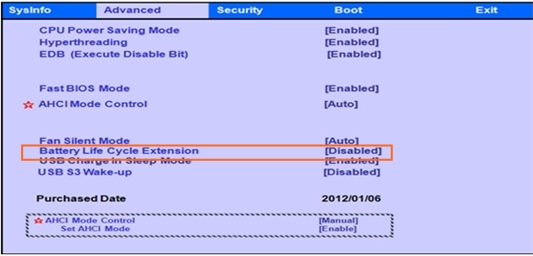 2. Advanced 항목에 가서 Battery Life Cycle Extension을 80%까지 충전을 원할 경우는 Enable, 100%까지 충전을 원할 경우는 Disable로 설정하면 됩니다.