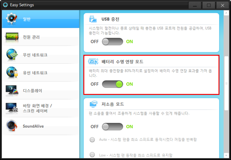 2. 일반 탭에 배터리 수명 연장 모드를 ON 또는 OFF로 선택합니다.