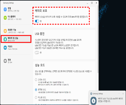 ※ Windows 10, 11 로 출시된 모델의 경우는 Samsung Settings에서 Battery Life Extender+ 라는 기능으로 85% 설정이 가능합니다.