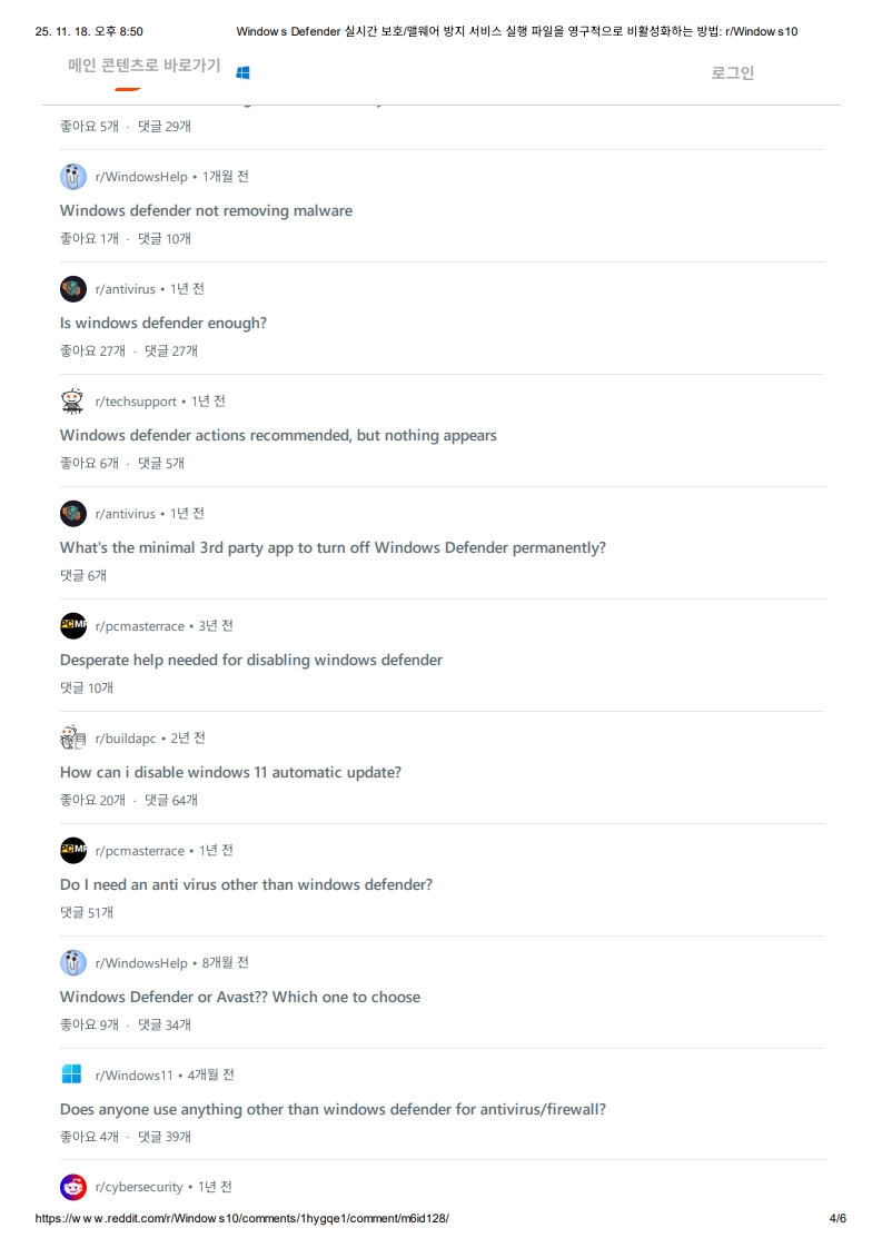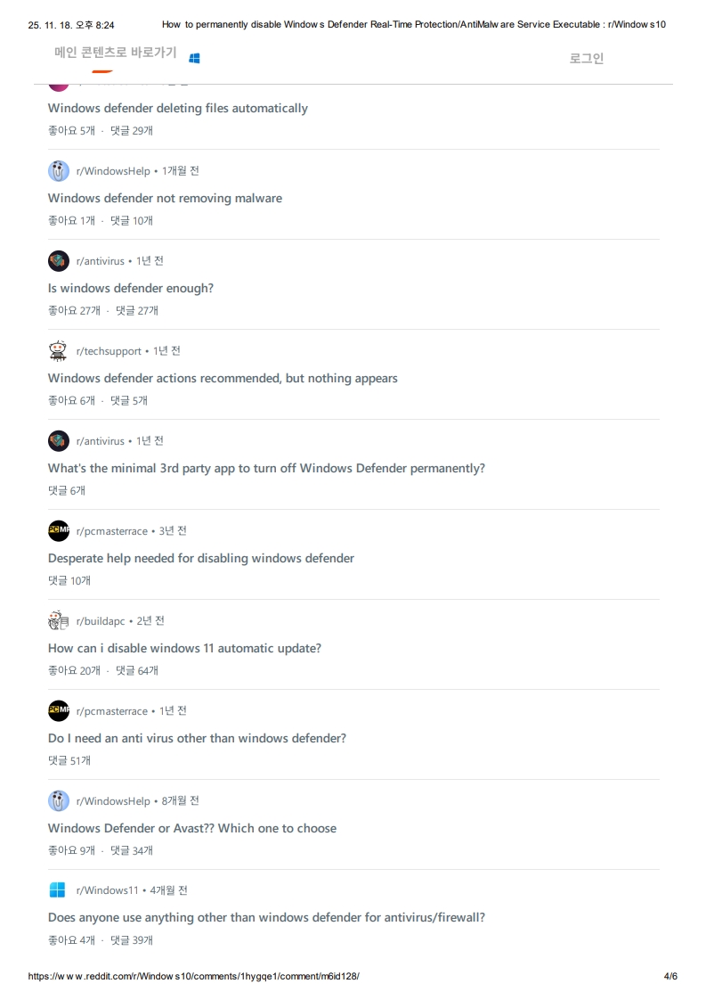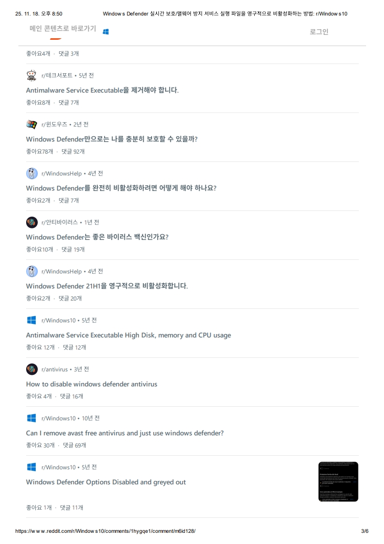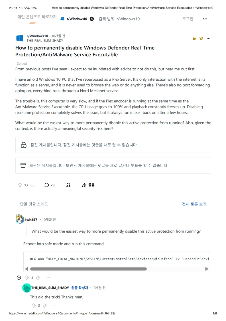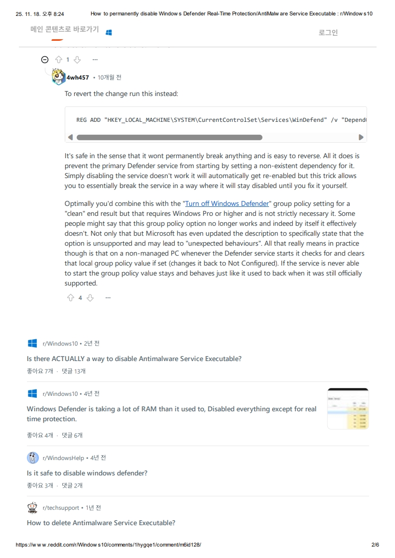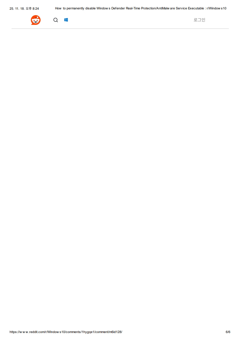 Windows Defender 실시간 보호/맬웨어 방지 서비스 실행 파일을 영구적으로 비활성화하는 방법: r/Windows 10